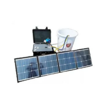 Solar-powered water purification unit that converts saltwater to potable water.